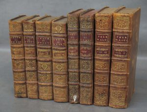 trouve, avec des titres séparés : "La Relation véritable. sur la mort de Voiture" ainsi que les comédies de "Jodelet duelliste" et de "L'Héritier ridicule". Reliures del'époque probablement exécutées par Luc- Antoine Boyet : un fer au soleil est présent sur les pièces de tomaison qui semble correspondre à celui représenté sur la reliure du n° 65 de la deuxième vente Esmerian. Le reste du décor ne vient pas contredire cette hypothèse. Reliures un peu frottées, accrocs aux coiffes de pied.— JOINTS : • BUSSY RABUTIN (Roger de). NOUVELLES LETTRES . [.] Nouvelle édition. Paris, Florentin Delaulne, 1714-1715 ; 4 vol. in-12, basane brune, dos à nerfs ornés de motifs dorés, pièces de titre rouges, [Rel. de l'époque], légèrement frottée, coiffes supérieures arasées. Restauration ancienne à un f., sinon bon exemplaire. • FÉNELON (François de Salignac de la Motte Fénelon). LES AVANTURES DETÉLÉMAQUE FILS D'ULYSSE. Quatrième édition conforme au manuscrit original. Paris, Veuve Estienne, 1740 ; 2 vol. in-12, veau fauve granité, dos à nerfs orné de fleurons dorés, pièces de titre et de tomaison rouges, [Rel. de l'époque], petits accrocs. 1) FRONTISPICE GRAVÉ SUR CUIVRE, [2] ff., lxvii p., [1] f., 499 p. (sur 503) et 10 (SUR 12) FIGURES GRAVÉES SUR CUIVRE HORS TEXTE .- 2) [2] ff., 477 p., [1] f. et 11 (SUR12) FIGURES ET UNE CARTE REPLIÉE GRAVÉES SUR CUIVRE HORS TEXTE .Deux feuillets de texte et 3 figures manquent. Le texte a été manuscrit anciennement en remplacement. Bon exemplaire.