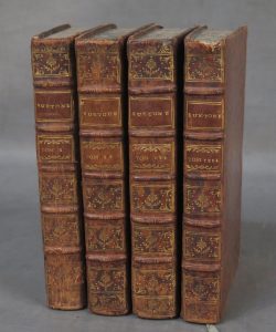 Suétone. Histoire Des Douze Césars. Avec des mélanges philosophiques & des notes. Paris, Saillant & Nyon, 1771 ; 4 vol. in-8, basane marbrée, dos à nerfs ornés de motifs dorés, tranches jaspées, [Rel. de l'époque], accrocs. Quelques accrocs...