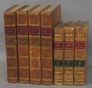 l'époque]. Ex-libris héraldique gravé par Maller (nom gratté). Quelques accrocs aux reliures, mais bon ensemble malgré tout.— JOINT : • GESSNER (Salomon). ŒUVRES. Paris, Bossange, Masson et Besson, an V - 1797 ; 3 vol. in-16, veau raciné, encadrement de motifs dorés sur les plats, dos lisses ornés de motifs dorés, pièces de titre rouges et de tomaison vertes, tranches dorées, [Rel. de l'époque]. FRONTISPICE, 3 TITRES GRAVÉS, 14 BELLES FIGURES H. T. GRAVÉS SUR CUIVRE . Très agréable exemplaire, malgré de pet. défauts aux reliures.