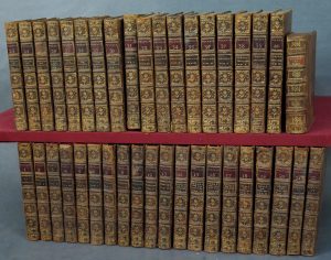 Voltaire. Œuvres Complètes ["édition encadrée"]. [Genève, Cramer et Bardier], 1775 ; 38 (sur 40) vol. pet. in-8, veau écaille, encadrement de trois filets dorés sur les plats, dos à nerfs ornés de motifs dorés, tranches cailloutées, [Rel....