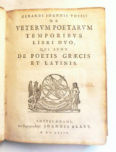 Vossius (Gérard Jean). De Veterum Poetarum Temporibus. Libri duo, qui sunt de poetis graecis et latinis. Amstelaedami, Joannis Blaeu, 1654 ; pet. in-4, reliure hollandaise en vélin, titre et date dorés au dos, [Rel. de l'époque]. Édition...