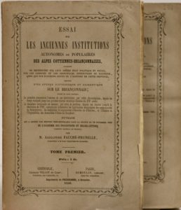 [Briançonnais].— Fauche-Prunelle (Alexandre). Essai Sur Les Anciennes Institutions Autonomes Et Populaires Des Alpes Cottiennes - Briançonnaises. Grenoble, Paris, Charles Vellot, Dumoulin, 1856-1857 ; 2 vol. in-8, brochés, dos passés. Rare...