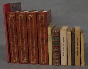l'édition originale parue à Troyes, chez Lacroix en 1884.— JOINTS : • [TROYES].- HEURES. HEURES LATINES ET FRANÇOISES, À L'USAGE DU DIOCÈSE DE TROYES. Première partie. Troyes, Chez la veuve Gobelet, 1783 ; fort vol. in-12, maroquin grenat, sur les pats encadrement de trois filets dorés avec fleurettes aux angles, dos à nerfs orné de motifs dorés, pièces de titre et tomaison vertes, tranches dorées, [Rel. de l'époque]. [5] ff., 767 p., [2] ff. Très petits manques à la reliure (coins, mors.), sinon plaisant exemplaire. • COFFINET (abbé). ARMORIAL DES ÉVÊQUES DE TROYES. Paris, Société française de numismatique et d'archéologie, 1869 ; pet. in- 4, bradel demi-percaline rouge, titre doré en long au dos. • Catéchisme du diocèse de Troyes. Tours, Mame, 1948 ; in-12. • Un autre. 1959 ; in-12. • 4 autres Catéchismes (Quimper, Autun, Lyon, Clermont).