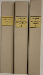 [Troyes]. Collection De Documents Inédits Relatifs à La Ville De Troyes Et à La Champagne Méridionale. Troyes, Dufey-Robert, Léopold Lacroix, 1878-1886 ; 3 vol. in-8, toile écrue, étiquette de titre et de tomaison au dos, couvertures...