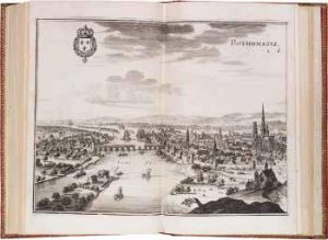 Zeiller (M.). Topographia Galliae sive descriptio et delineatio famosissimorum locorum in potentissimo Regno Galliae… Francfort, Merian, 1655-1661, 13 parties en 4 vol. in-4°, t. I : 6 ff. (titre gravé, titre, dédicace), pp. 5-80 de texte, 2