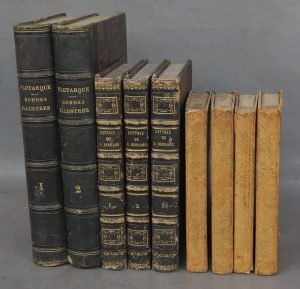 frottés, quelques accrocs. JOINTS : • [PEYRONNET (Jean-Marie)]. LETTRES DE SAINT BERNARD, [^] traduites en français sur l'édition des bénédictins de 1690. Lyon, F. Guyot, 1838 ; 3 vol. in-8, demi-basane aubergine, dos à nerfs ornés, [Rel. de l'époque]. Barbier, II, 1261 . Reliures un peu frottées. Feuillet de titre du 3e vol. fortement bruni. • PLUTARQUE. LES VIES DES HOMMES ILLUSTRES. Paris, Firmin Didot frères, 1849 ; 2 vol. in-8, demi-chagrin noir, dos à nerfs ornés, [Rel. de l'époque], une coiffe manquante.