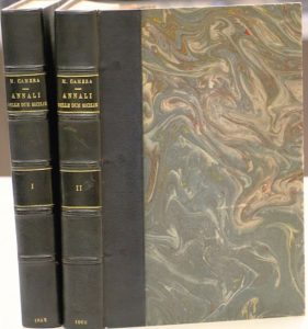 Camera (Matteo). Annali Delle Due Sicilie Dall ' Origine Efondazione Della Monarchia Fino Atutto Il Regno Dell ' Augusto Sovrano Carlo Iii Borbone. Napoli, Stampa e Cartiere del Fibreno, 1841-1860 ; 2 vol. gr. in-8, demi-chagrin noir, dos à nerfs,...