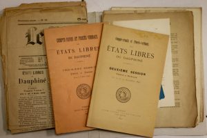 cercles catholiques d'ouvriers.-L'Univers : 5 parutions, du 12 au 15 novembre 1888, et 13 septembre 1892. - Le Messager de Valence : 6 numéros, du 20 octobre, 14 novembre 1888, 23, 24 et 25 janvier 1889 et 6-7 mars 1893. États libres du Dauphiné : Deuxième session, tenue à Romans les 12 et 13 décembre 1891 (10 pièces) : Compte- rendu et et procès-verbaux, in-8 broché, 72 p. Imprimerie Valentinoise, 1891.- Invitation aux États Libres de décembre 1891, 3 p., 1 ff., Imprimerie Valentinoise, 1891 .- Programme des questions agricoles qui seront traitées à la prochaine tenue des États Libres, 3 p., Imprimerie valentinoise, 1891 (3 exemplaires).- Programme des questions ouvrières etindustrielles, 3 p. (2 ex.).- Programme des Assemblées des 12 et 13 décembre 1891 , 2 p.- Carte de délégué aux États Libres du Dauphiné de décembre 1891 au nom de Monsieur de Bouffier.- Troisième session, tenue à Voiron les 4 et 5 mars 1893 (4 pièces) : Invitation manuscrite, sous enveloppe, de H. Gailhard-Bancel adressée à M. de Bouffier en date du 27 février 1893.- Invitation programme de la 3e session des États, 3 p. Voiron, Imp. A. Mollaret, 1893.- Carte de délégué (vierge) des États Libres, troisième session.- Compte-rendu et procès-verbaux de la troisième session, in-8 broché, 41 p., Voiron, Auguste Mollaret, 1893. Assemblée commémorative des États du Dauphiné (1 1 pièces) : Invitation aux réunions commémoratives des 10 et 11 novembre 1788 à Romans, 1 p., 1888.- Voeux des agriculteurs, projet de doléances exposées à l'occasion du centenaire, 4 p., Valence, Imp. Valentinoise, 1788 (3 ex.).- Voeux des commerçants, projet, 4 p.- Voeux des industriels, projet, 3 p.- Vœux relatifs aux rapports des patrons et des ouvriers, projet, 3 p.- Carte d'entrée n° 352 pour l'Assemblée commémorative, délivrée à M. de Bouffier.- Programme de l'Assemblée (2 ex), 4 p., accompagné de la lettre imprimée de Sa Grandeur Monseigneur Cotton, évêque de Valence, à M. H. de Gailhard-Bancel, président du Comité d'organisation de l'Assemblée tenue à Romans les 10 et 11 novembre 1888, 4 p. Invitation de la mairie de Grenoble à assister à l'inauguration du monument commémoratif des États du Dauphiné, à l'occasion du passage du président Félix Faure, adressée à M. de Bouffier, juillet 1 897. Document imprimé de 2 p., bandeau chromolithographié, dans une enveloppe manuscrite. Centenaire (5 pièces) : La-Tour-du-Pin Chambly : Épilogue du centenaire de 1788, in-8 broché, 19 p., Bar-le-Duc, Typ. de l'Œuvre de Saint-Paul, vers 1888.- Essai sur les cahiers de 1889, in-8 broché, 18p., Bar-le-Duc, vers 1889.- Programme résumé de l'Assemblée projetée par plusieurs descendants ou représentants des députés aux États du Dauphiné, signé Gailhard-Bancel, 3p., Imprimerie Valentinoise, 1888 (2 ex.).- Actualité politique. Le Centenaire de 1789. Les hommes du passé et les hommes du jour. De Louis XVI à Mr Carnot, par E. D'Argill, avertissement de l'auteur, table de l'ouvrage et bulletin de souscription, in-8 de 4 p., Charlieu, Imp. J. Alix fils, vers 1888.