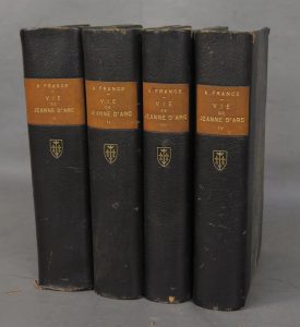 France (Anatole). Vie De Jeanne D'Arc. Paris, Manzi, Joyant & Cie, Calmann-Lévy, 1909-1910 ; 4 forts vol. gr. in-8, demi-chagrin bleu nuit à coins, dos lisses ornés d'un petit blason doré, pièces de titre chamois, têtes dorées, couvertures et...