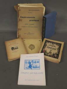 • CURNONSKY. LES AVATARS D'UN CLIENT SÉRIEUX. [Paris], Draeger, sd, in-8 de 31 p., couverture rempliée. Plaquette imprimée pour le restaurant L'Écu de France. • DUTREY (Marius). CALENDRIER GASTRONOMIQUE. Histoires de cuisine et cuisine de l'histoire. Londres, Frederick Books, George Allen & Unwin, 1960, pet. in-8, reliure anglaise de l'époque maroquin bleu roi, sur les plats encadrement d'un filet fin doré, dos à nerfs orné de motifs dorés, tranches dorées, étui bordé de même maroquin [bound by Sangorsky & Sutcliffe London England]. Envoi autographe signé de l'auteur. Dos légèrement passé, sinon exemplaire tout-à-fait désirable. • ESCHOLIER (Raymond). CANTEGRIL. Paris, Georges Servant, 1 926, in-8, broché, couv. illustrée. BOIS ORIGINAUX DE PIERRE FALKÉ, AQUARELLÉS. Première édition illustrée de ce roman. L'un des 350 exemplaire numérotés sur papier vélin d'Arches. Accrocs à la couv., restauration avec du scotch. • PAILLERON (Marie-Louise). LES AUBERGES ROMANTIQUES . Paris, Firmin-Didot et Cie, 1929 ; in-8, broché. • ROCHAS D'AIGLUN (Anne). CONTES GOURMANDS , illustrés par l'auteur. Paris, Aux amateurs de livres, 1984 ; in-8, broché.