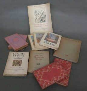 de la Nouvelle France, 1944. Frontispice et figures gravées sur bois en couleurs. L'un des XV exemplaires numérotés hors commerce sur papier vélin blanc du Marais. • MONTHERLANT (Henry de). SOUS LES DRAPEAUX MORTS . Paris, Éditions du Capitole, 1 929. Compositions de Edy Legrand. L'un des exemplaires numérotés sur papier alfa. • CERVANTES. LE RUFIAN HEUREUX. Paris, Masques, Société générale d'édition, 1947. Compositions deGeorges Maret. L'un des 150 exemplaires numérotés sur papier vélin de Rives. Dos de la couverture cassé. • PAGNOL (Marcel). FANNY.— CÉSAR.— MARIUS. Paris, Éd. du Panthéon, 1952 ; 3 vol. pet. in-8, brochés. Aquarelles de Gérard Cochet reproduites en couleurs. L'un des ex. num. sur papier vélin d'Annonay. • BANNMEYER BONMATI (Mercédès). ROMANCERO RIFFAIN ET L'EXILÉE DE LA MER. Rabat, Éd. Félix Moncho, 1946. Édition originale, ornée de compositions en couleurs de A. M. Blaupot Ten Cate. Préface de Henri Bosco. • CHAUVIRÉ (Roger). GREG LE LIBÉRATEUR. Paris, Flammarion, 1949 ; cartonnage d'éditeur àdécor polychrome. L'un des 300 exemplaires numérotés sur papier vélin des Vosges, réservés aux bibliophiles des Sélections Lardanchet. On joint un second exemplaire, du tirage courant. • VERCEL (Roger). LA CARAVANE DE PÂQUES. Paris,Albin Michel, 1948 ; cartonnage d'éditeur àdécor polychrome. Deux exemplaires, du tirage courant.