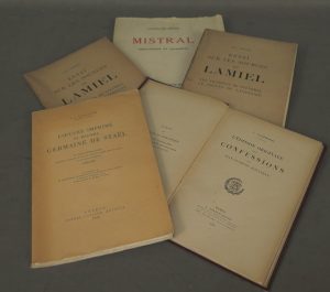 Extrait duBulletin duBibliophile. Tiré à160 exemplaires.— JOINTS : • LONCHAMP (F.-C.). L'ŒUVRE IMPRIMÉ DEMADAME GERMAINE DESTAËL. Description bibliographique raisonnée et annotée de tous les ouvrages publiés par ses soins ou ceux de ses héritiers (1786-1821). Accompagnée de 36 reproductions documentaires en fac- similé des titres originaux et ornée, en frontispice, d'un portrait ancien de Madame de Staël. Genève, Cailler (masqué par une étiquette Lausanne, chez l'auteur), 1949 ; in-8, broché, non coupé. Premier et seul volume de la collection "Documents bibliographiques" des éditions Pierre Cailler. • CHARLES-BRUN. MISTRAL. PRÉCURSEUR ETPROPHÈTE. 1930 ; in-4, broché. Édition originale. L'un des 350 exemplaires numérotés sur papier vélin de Rives à la cuve. Bon exemplaire. • PRÉVOST (Jean). ESSAI SUR LES SOURCES DE LAMIEL. Les Amazones de Stendhal. Le Procès de lacenaire. Lyon, s. n., 1942 ; plaquette in-8, brochée, non rognée. Deux exempalires.