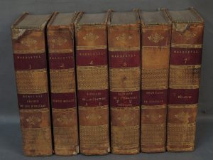 Marmontel (Jean François). Œuvres. Paris, A. Belin, 1819-1820 ; 6 forts vol. in-8, basane racinée, encadrement de roulettes dorées sur les plats, dos lisses ornés de motifs dorés, pièces de titre rouges, [Rel. de l'époque], accrocs aux dos et...
