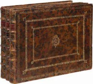 Collation : un titre en fac-similé, pl. 2-150 ; un titre-gravé, pl. 2-77 ; un titre-gravé, pl. 2-37, 38a, 38b, 39-86, 99-126, 87-98. ÉDITION ORIGINALE et PREMIER TIRAGE. Considéré comme étant le plus marquant des livres illustrés jamais publiés en Scandinavie, l’ouvrage est né d’un projet initié par le roi Charles X Gustave, en 1661, qui confia un privilège de dix ans au comte Erik J. Dahlberg (1625-1703) pour éditer un livre de topographie sur le royaume de Suède et ses provinces. Aidé par quelques artistes, Dahlberg réalisa les dessins puis engagea les plus célèbres graveurs de l’époque aussi bien en France qu’en Suède et aux Pays-Bas : Jean Le Pautre, Jean Marot, les frères Perelle, Herman Padt-Brugge, Willem Swïdde, J. van der Aveelen, Erik Retz, Truls Arridson…, qui interprétèrent les dessins sous la direction du comte. Ce n’est qu’en 1716 que les planches furent prêtes pour l’impression, étape dont se chargea l’imprimeur Jan Gros de Vries. Le texte français-latin dont la rédaction avait été confiée à des professeurs de l’université d’Uppsala, ne fut jamais terminé, seuls quelques passages imprimés en 1698 firent l’objet d’une publication séparée. Un premier jeu de 600 exemplaires sans texte fut mis sur le marché en 1726, puis un second de 400 en 1769. Bel exemplaire dont les petites vues furent contre-collées sur des feuillets au format du volume. Par l’emploi de ces feuillets au filigrane des armes de la ville d’Amsterdam accompagnées de la date de 1749, on peut établir que la reliure a été réalisée dans les années 1750. Le volume ne contient ni les pages de titre courantes qui ne sont connues qu’en deux exemplaires, ni le rare texte composé par Per Lagerlöf. Reliures épidermées et quelques rousseurs éparses. Coiffe supérieure du t. I restaurée. Dimensions : 305 x 400 mm. Provenances : le lion rampant frappé au centre des plats laisse penser que le premier propriétaire put être un duc du Brabant, province belge, ou un duc du Hallandia en Suède ; Augustin Legillon (Cat., Bruges, 16 mai 1834, n° 192 « Suecia antiqua et hodierna, 3 vol. cum fig. Holmiae v. m. d. s. tr. et plats. »), avec son ex-libris daté Bruges, 1809. BAL, I, n° 772 ; Millard, III, 16 ; Lipperheide, 1037 ; Katalog Berlin, 2256 ; Hofer, 93 ; Warmholtz, 207 ; Collyn, Sveriges Bibliographi 1600 - Talet, col. 197 ; Klemming pp..