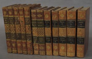 érotiques, Les Chansons madécasses, etc. Le cinquième volume est constitué par La Guerre des dieux. Dos un peu passés (quelques manques), intérieur bien frais.— JOINTS : • CHENIER (Marie-Joseph de). Théâtre (3 vol.).— Poésies (2 vol.). Paris, Baudouin, 1821-1822 ; ens. 5 vol. pet. in-12, basane racinée, dos lisses ornés de motifs dorés, pièces de titre et de tomaison noires, [Rel. de l'époque]. PORTRAIT GRAVÉ SUR ACIER EN FRONTISPICE (pour les Poésies). Bon ensemble en reliures de l'époque uniformes. • YOUNG. LES NUITS D'YOUNG, traduites de l'anglais par M. Le Tourneur. Paris, Ledentu, 1821 ; 2 vol. in-12, basane racinée, encadrement d'un filet torsadé sur les plats, dos à nerfs ornés de motifs dorés, pièces de titre et de tomaison vertes, [Rel. de l'époque]. DEUX FRONTISPICES GRAVÉS SUR ACIER. Exemplaire correct.