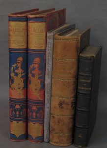 nombreuses figures de Robida dans le texte. Intérieur frais.— JOINTS : • GAUTIER (Théophile). LE CAPITAINE FRACASSE. Illustré de 60 dessins de Gustave Doré. Paris, Charpentier, 1866 ; fort vol. gr. in-8, demi-chagrin marron, dos long, [Rel. de l'époque], dos entièrement épidermé, plat sup. désolidarisé du corps d'ouvrage mais tenant au dos. FIGURES GRAVÉES SUR BOIS HORS TEXTE DE GUSTAVE DORÉ. Légères rousseurs. • FÉNELON. LES AVENTURES DE TÉLÉMAQUE. Paris, Furne et Cie, 1860 ; in-8, demi-chagrin vert sapin, dos à nerfs orné de caissons à froid, H doré en pied, [Quinet], coiffes un peu frottées. FIGURES HORS TEXTE GRAVÉES SUR ACIER D'APRÈS MOREAU. • DUHAMEL (Georges). LES JUMEAUX DEVALLANGOUJARD. Soixante dessins de Berthold Mahn.Paris, Paul Hartmann, s. d. ; in-4, cartonnage de l'éditeur, toile bleue, illustration dorée sur premier plat, titre doré à la chinoise au dos, cartonnage défraîchi. Composition de Berthold Mahn dans le texte, certaines en couleurs.