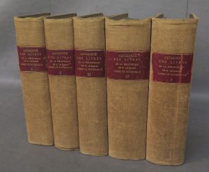 Rothschild (James de). Catalogue Des Livres Composant La Bibliothèque De Feu M. Le Baron James De Rothschild. Paris, Damascène Morgand, 1884 ; 5 forts vol. in-4, toile grège, pièces de titre rouges au dos, têtes rognées. Édition originale de...