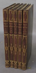 Librairie des bibliophiles, 1878 ; 5 vol. in-8, bradel demi-chagrin chocolat à coins, dos orné en long de motifs dorés, tête dorée, non rogné, couverture conservée. PORTRAIT DE VOLTAIRE EN FRONTISPICE ET 1 1 FIGURES GRAVÉES SUR CUIVRE PAR LAGUILLERMIE. Précieux exemplaire du tirage de tête, l'un des 20 exemplaires numérotés sur papier de Chine, avec les figures en double épreuve, avant et après la lettre. Celui-ci a été enrichi d'une suite des figures sur papier du Japon et d'une autre suite des figures sur papier de Hollande, toutes deux avant la lettre. Quelques piqûres, parfois plus prononcées sur les figures sur papier de Hollande et du Japon. Bel ensemble.