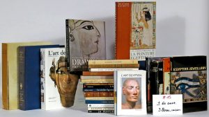 Ouvrages généraux (par Ragai, Forman, Manniche, Fechheimer, Stevenson, Smith, Donadoni, Aldred, Robins, Davies, Gardiner, Champdor, etc.), sur la peinture (par Tefnin), les artistes, divers thèmes (les oiseaux, les scarabées, les motifs non figuratifs, les fleurs, les couleurs par Gilbert), les arts appliqués (bijoux, orfèvrerie, miroirs), les statues, le "Catalogue des chaussures égyptiennes" du Musée du Louvre, l'"Atlas of Egyptian art" de Prisse d'Avennes, "L'art de l'Égypte" (éd. Mazenod), etc.