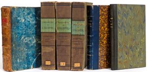 JOINT, sur le sujet : (1). [GALLAND, Antoine].- Tableau de l'Égypte, pendant le séjour de l'armée française, avec la position et la distance réciproque des principaux lieux [...]. P., Cerioux, Galland, an XI [1803], 2 t. en 1 vol. in-8° demi-veau, plats de papier marbré (fort us.). Édit. orig., ex. complet des 2 tableaux. Galland fit partie de l'expédition d'Égypte en tant qu'imprimeur.-- (2). Description de l'Égypte. Recueil des observations et des recherches [...], 2e éd. P., Panckoucke, 1821, 3 vol. in-8° br. (non coupés). Vol. consacrés à l'Antiquité (nombr. rouss.).-- (3). ROY, J.J.E.- Les Français en Égypte ou Souvenirs des campagnes d'Égypte et de Syrie par un officier de l'expédition [...]. Tours, Mame, 1868, in-12° demi-chagrin bleu marine (coiffes, mors et nerfs frottés).