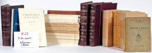 (1). Musées : Le Caire (divers catalogues), MRAH de Bruxelles (idem), British Museum (idem), Louxor, Bologne, Turin, Paris (Le Louvre), Marseille, Lyon, Chalon-sur-Saône, Vienne, Leipzig, Hildesheim, Amsterdam, Oxford (Ashmolean), Cambridge (Fitzwilliam), Vatican, San Francisco, Yale, New York Metropolitan Museum (2 dont un par W.C. Hayes) et Brooklyn, Boston, etc.-- (2). Mélanges (Liber amicorum) offerts à des égyptologues : Étienne Bernard, Claude Vandersleyen, Bernard Bothmer, Hermann De Meulenaere, Richard Parker, Joseph Vergote, Jean Capart.-- (3). Biographies : Mariette (plusieurs ouvr.), Flinders Petrie, Conrade Leemans.-- (4). Sur l'archéologie : par Ceram (2), Vandier (7 vol., 1952-1969), Solé, Hornung, Rosalie David, Brian Fagan, British Egyptology 1549-1906 par J.D. Wortham (1971).-- (5). Revues : Chronique d'Égypte, 1946-1992, 37 vol. épars; Archeological report 1892-1893 et 1898-1899, 2 vol.