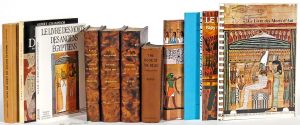 JOINT : (1). 2 illustrated works of the same author : The Book of the Dead. The chapters of coming forth by day [- A vocabulary in hieroglyphic to the Theban recension]. London, 1898, 3 vol. in-8° marbled sheepskin, wrappers preserved (dampstains incl. on the binding, larger in 1 vol., one upper board strongly rubbed, 1 joint partly split, small defects),- The Book of the Dead. 2d edition. London; NY, 1923, 3 parts in 1 vol. in-8° publisher's cloth (rare foxing).-- (2). 8 modern works on the same subject of which studies or translations of Champdor, Speleers, Slosman, de Caluwe and Kolpaktchy.