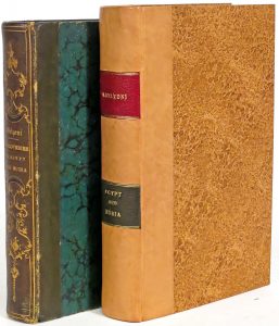 Modern binding : half blond calf, marbled paper boards, flat spine with green and red morocco labels, wrappers preserved (flyleaves renewed, corners and spine of the wrappers repaired, handwritten note, foxing and small stains on the upper one).