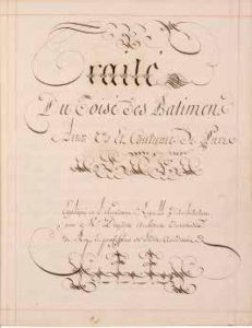 étoilé doré, tranches dorées (reliure de l’époque). L’auteur : Après avoir publié en 1682 son ouvrage, Les Édifices antiques de Rome... (v. n° 64), qui est l’aboutissement de son voyage en Italie, fait à la demande de Colbert, Desgodetz tomba dans un relatif oubli. Il fallut attendre 1693, soit dix ans après la mort de son protecteur Colbert, pour que son livre trouve audience auprès de l’Académie royale d’architecture. Il fut nommé académicien en 1694 et succéda à La Hyre comme professeur royal en 1718. Mort en 1728, François Bruand le remplaça dans cette fonction. Texte : Ce manuscrit est une copie très soignée faite du vivant de l’auteur, d’après le cours qu’il donna à l’Académie royale d’architecture. On peut le dater des années. Nous en avons localisé un autre à la bibliothèque de l’Université de Colombia au Canada. Divisé en quatre sections, il traite du toisé de la maçonnerie, charpente, menuiserie, serrurerie, dorure, peinture...Le texte, une fois remanié, fit l’objet de plusieurs éditions posthumes, la première datant de 1748. Illustration : L’iconographie se compose de 33 figures et de nombreux diagrammes répartis sur 18 ff. reliés à la fin. Dimensions : 191 x 151 mm. Provenances : La Bourrié, mention manuscrite « n° 513 du Supplément au catalogue de N. La Bourrié » ; ex-libris partiellement arraché en fin de volume.