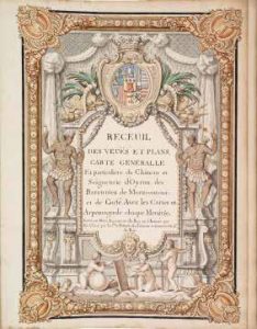 en l’année 1713 : et orné par le Sr Le Pautre architecte et graveur Ord. du Roy. 1713. In-folio, maroquin rouge, élégante roulette à entrelacs autour des plats, alternant pot de fleurs et pièces d’armes (château, trois têtes de Maure), armes au centre surmontées du titre frappé en lettres dorées, dos à nerfs orné de même, tranches dorées (reliure de l’époque). Historique : Situé au nord des Deux-Sèvres, Oiron recèle un immense château au milieu d’un parc de 2500 hectares aux vastes perspectives, dont l’histoire se confond avec la destinée de la famille Gouffier. Guillaume Gouffier, valet de chambre de Charles VII, se vit offrir par le roi, en 1450, une seigneurie, sur laquelle il fit élever une vaste demeure fortifiée, organisée autour d’une cour carrée fermée, avec corps de logis principal face à l’entrée, et flanquée d’une tour ronde à chaque angle. Avec ses enfants, Oiron va briller de tout son éclat. Artus, gouverneur du futur François Ier et grand maître de France, entreprend d’agrandir ce logis, à la fois château de plaisance et forteresse de plaine, d’une galerie adossée à la courtine nord-est, et d’édifier une collégiale, dont la conception est héritée du style gothique tardif. Située à faible distance du château, elle était destinée à abriter les mausolées familiaux. Après sa mort, en 1519, son fils Claude, grand écuyer en 1546, prend la succession et fait ériger sa baronnie en duché. Il parachève les constructions du château afin que ses exceptionnelles collections y soient abritées. La galerie d’étage, située dans l’aile nord-est, renferme alors l’un des plus grands cycles de peintures de la Renaissance après Fontainebleau ; le seul dû à un artiste français avant 1550. Ses collections sont pillées à deux reprises par les Huguenots. Il faut attendre Louis, petit-fils de Claude, pour qu’Oiron retrouve son lustre. Disgracié puis condamné comme faux-monnayeur en 1630, pour s’être dressé contre l’autorité du cardinal de Richelieu, il s’exile à Oiron où il entreprend de rebâtir le château en surélevant la moitié du corps central et le pavillon sud, dit pavillon du roi. Il confie à des artistes parisiens la décoration, dont le cabinet des Muses, la chambre et la salle du roi offrent le meilleur exemple. Le Brun réalise notamment des portraits pour les appartements du roi. Après la mort prématurée du fils de Louis, la seigneurie échoit à son petit-fils Artus III, ami de Blaise Pascal, qui la cède à son tour à sa sœur, épouse de François d’Aubusson. Ce dernier entreprend alors de faire d’Oiron un grand palais classique en lui conférant une symétrie qu’il n’avait jamais eue. Il rhabille les constructions de la Renaissance pour terminer le corps central et obtenir en pendant du pavillon du roi, un pavillon d’angle, dit pavillon des trophées. Symétriquement à la galerie Renaissance, là où Louis Gouffier avait prévu une aile, il crée un portique ouvert portant une terrasse de plain-pied avec les appartements de l’étage. Tel est le château, lorsque la marquise de Montespan, disgraciée et éloignée de la cour, le rachète en 1700 pour son fils légitime, le duc d’Antin. Elle poursuit l’achèvement intérieur du pavillon des trophées pour s’y installer, et parachève la composition de la cour d’honneur en élevant la tour des gardes en pendant de celle du connétable, située à l’extrémité de la galerie de François d’Aubusson. À la mort de la marquise, en 1707, le duc d’Antin hérite du château dont il se désintéresse, le jugeant trop éloigné de la Cour. Oiron entame alors une lente décadence et connaît plusieurs propriétaires : le marquis de Villeroy, puis la famille Fournier de Boisairault... La révolution précipite son déclin. Des campagnes de restauration furent entreprises en 1820, puis de 1869 à 1873, par l’architecte Daviau, mais restèrent insuffisantes pour assurer la pérennité du château. Ce dernier, classé monument historique en 1923, fut acquis par l’État afin d’assurer sa sauvegarde. Il est devenu aujourd’hui un lieu dédié à l’art contemporain. Iconographie : À notre connaissance, cet album est le document iconographique le plus important que l’on puisse consulter sur Oiron. Un état manuscrit des arpentages des domaines d’Oiron, Cursé et Montcontour, établi par Matis, est conservé au département des manuscrits de la Bibliothèque nationale (NAF 17384). Il existe aussi un plan, levé en 1699, à la demande de Roger de Gaignieres (1642-1715), lorsqu’il effectua un voyage en Poitou et se porta acquéreur d’une partie des collections de Claude Gouffier, dont le célèbre portrait de Jean Le Bon aujourd’hui au Louvre. L’idée du duc d’Antin, en commandant cet album, était d’illustrer l’arpentage de ses terres dressé par le géographe du roi Matis, souvent nommé dans les comptes des Bâtiments, et mis au net par le dessinateur Dubois. Ici, on compte 15 cartes détaillées des terres, lieux-dits et fermes. Ces plans plutôt techniques, accompagnés d’un commentaire explicatif, sont précédés de 5 vues en perspective et de 4 plans du château. Le cycle iconographique se complète par un frontispice, un plan de la bataille de Montcontour remporté par l’armée de Charles IX et un cul-de-lampe figurant le chiffre entrelacé du duc d’Antin. Ces dessins très soignés ont été aquarellés. Le frontispice, les vues perspectives et le cul-de-lampe furent exécutés par Pierre Le Pautre, selon l’indication portée sur la page de titre. Pour Bertrand Jestaz, le retable qui, au frontispice, porte le titre du recueil aurait été dessiné d’après un modèle d’Hardouin-Mansart. Pierre Le Pautre (1652 (?)-1716), un brillant dessinateur, abondant et inventif. Pierre Le Pautre, fils aîné du célèbre Jean Le Pautre, est connu comme graveur et surtout dessinateur