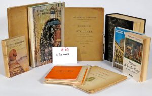 Le temple de l'homme (par Schwaller de Lubicz, 3 vol.), plusieurs ouvr. sur la Nubie dont certains en anglais (par Desroches-Noblecourt, récits de Banks, Welsby, Shinnie, Fouchet...), des tirés à part dont Letronne (Mémoires Institut Imp. de France, 1864, 2 vol.), thèse dactylogr. sur le "Conseil des Trente" par Aristide Theodorides, etc.-- STAR, Maria.- Terre des symboles, ill. par Mainella. P., Gazette des Beaux-Arts, 1903, br. sous couv. gaufrée (fort défraîchi, dérelié, abimé, complet des 12 ill. en couleurs, envoi aut. à Maurice Maeterlinck, "le Précurseur de la Pensée humaine [...]").
