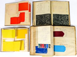 (1). Registre in-4° carré (H. : 4 cm de documents dont une partie en tête bêche), en français et néerl., 1936-1939.-- (2-4). Trois registres in-8° agenda, en allemand, s.d. : classés par couleurs (jaunes, rouges, bruns noirs).-- (5). Registre gr. in-8° carré, en néerl., 1911-1913.-- (6). Registre ms. (sans échantillon) pour la "Préparation des couleurs pour les marbrés [...]", in-8°, en français, s.d.