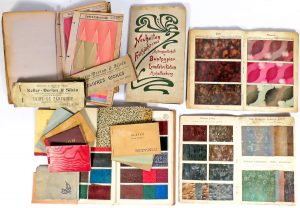 Quelques noms de fabricants : "La Turnhoutoise", "La Belgica", livret "Stammtafel der Familie Dessaur" (1962), Keller-Dorian & Silvin de Lyon, Kaycrest de New York, etc., mais la grande majorité des échantillons sont présentés sans mention de lieu ni nom. Avec 3 livrets Art Nouveau en allemand et 1 farde contenant des notes, recherches, coupures de journaux.