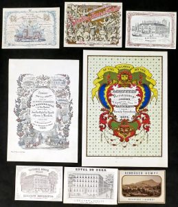Publicités (Victoria Hôtel à Berlin, brasserie et vinaigrerie Antheunis à Grammont, Hôtel de Vienne à Gand, fabrique d'instruments à Budapest, recueil de 18 chansons pour la "Vlaemsche Letteroefening"...), voeux pour l'année 1838 des travailleurs "à la pièce" gantois, vues (Neustadt an der Haardt, église St-Charles-Borromée à Anvers), etc.