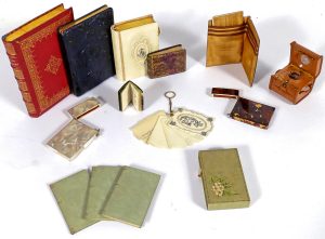 11 objets divers 19e s. : carnets de bal ou de notes, étuis à cure-dents, encrier, porte-photographies, livres (dont minuscula)...