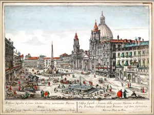 "Les bâtiments Superbes et fontaines de la Place Navone à Rome". Légendées en latin, italien, allemand et français. Vue animée de la Piazza Navone (pet. déchirure au milieu en haut, manque au coin sup. dr. redessiné à la plume).-- "Vüe de Basilique de Ste Marie la grande, avec les deux bâtiments latérale du dit Basilique à Rome" (pet. déchirure au milieu en haut).