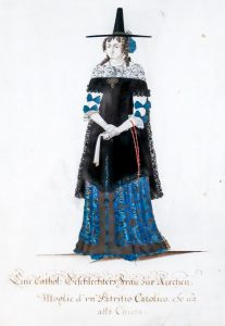 (1). "Eine Magd bey der hochzeit / Una Massara, che va al Pasto delle Nozze è Ballo" [Jeune fille se rendant à une noce et au bal].-- (2). "Ein Jungfer im Winterhabit im hauss / Donzella in Casa d'Inverno" [Jeune fille en habit d'intérieur d'hiver].-- (3). "Eine Luther Jungfer in hausshabit über die Gasse / Donzella Luterana, che và à spasso" [Jeune luthérienne en promenade].-- (4). "Eine Cathol: Geschslechters Frau zur Kirchen / Moglie d'un' Patritio Catolico, che và alla Chiesa" [Jeune catholique se rendant à l'église].