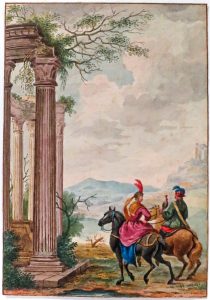 Paire de putti, c. 1600. DESSIN ORIGINAL, plume à l'encre bistre, papier vergé non filigrané, 13,3 x 11,5 cm.-- Deux cavaliers devant une ruine dans un paysage montagneux, 2e moitié du 18e s. AQUARELLE ORIGINALE, papier vergé non filigrané, 15,8 x 11 cm.-- DELLA BELLA, Stefano (1610-1664).- Chasse aux cerfs. Eau-forte, cuv. 14,9 x 2,5 cm (rognée en deça de la cuv.).-- FALDA, Giovanni Battista (1648-1678).- Deux fontaines. Eau-forte, cuv. 35,5 x 24,2 cm (rognée en deça de la cuv.).-- VITALI, Pietro (c. 1755-c. 1810).- "Silentium et tenebras Amor [...]". [D'après Guido RENI (1575-1642)]. Eau-forte, 29 x 21 cm + très grandes marges (plis).