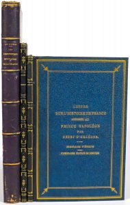 Rel. de l'époque : demi-chagrin bleu, plats de percaline chagrinée bleue sertis de filets et fleurons angulaires dorés, plat sup. titré doré "Lettre/ sur l'histoire de France/ adressée au/ Prince Napoléon/ par Henri d'Orléans.// Exemplaire d'épreuve// Exemplaire édition de Londres" (rares pet. défauts, pet. étiq. collée sur le contreplat sup.).