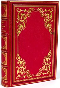 Rel. de l'époque : plein chagrin rouge, plats cernés de filets dorés, d'un filet gras à froid et d'un encadrement fleuronné doré, dos à nerfs fleuronné doré, doublures et gardes de soie moirée, filets dorés sur les coupes, roul. fleuronnées dorées sur les remplis, tr. dorées (griffes, taches sur le plat sup., coins lég. émoussés, billet ms. collé sur la garde sup.). Sous emboîtage (usé).