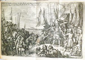 EERSTE UITGAVE van dit historisch werk waarin de Amsterdamse schouwburgdirecteur van Domselaer (1611-c. 1685) hoofdzakelijk de Frans-Nederlandse oorlog behandelt. Rijkelijk geïllustreerd (waarschijnlijk volledig) met 3 gegraveerde titelplaten, 7 uitvouwbare platen van Romeyn de Hooghe (o.m. een kaart van de Zeventien Provinciën en afbeeldingen van de belegering van Groeningen, Franse tirannie op Hollandse dorpen en de terechtstelling van de gebroeders de Witt), 23 portretten door o.a. Christiaan Hagen, 20 kopergravures (o.m. zeeslagen en de belegering van Maastricht) waarvan 13 van de hand van J. Sorjoue en 1 plaat met het wapen van de admiraal Tromp.