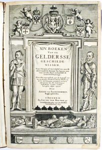 EERSTE UITGAVE VAN DE VERTALING door de rechtsgeleerde Arend van Slichtenhorst (1615-1657) van het werk "Historiae Gelricae libri XIV" (1ste uitg. : 1639) van de Nederlandse hoogleraar Pontanus (1571-1639). Geïllustreerd met een titelplaat, 20 kaarten of plattegronden op dubbele pagina (o.m. Zutphen, Arnhem, Veluwe en de wildbaan te Dieren), 1 uitvouwbare kaart van Gelderland en 29 afbeeldingen van penningen en wapenschilden in de tekst. De platen zijn van de hand van Nicolaas Van Geelkerken, landmeter van Gelder en Zutphen.