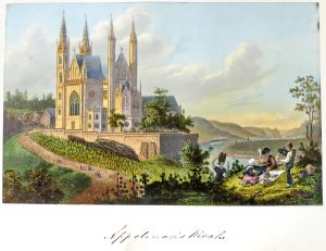 SEIZE BELLES EAUX FORTES non signées, 15 x 22,5 cm, ENTIÈREMENT PEINTES avec rehauts de gomme, légendées en allemand à la main sur le papier de support. Scènes pittoresques avec vues de Bonn, l'église Saint-Apollinaire à Remagen, Godesberg, les Sept montagnes et Rolandseck, l'église d'Andernach, Stoltzenfels, le rocher de la Lorelei, Mausethurm, Pfalz, Rheinstein, Wiesbaden, Biebrich, Mayence (2), Heidelberg et Ems. Avec une vue de nuit, une autre avec arc-en-ciel, plusieurs avec bateaux...