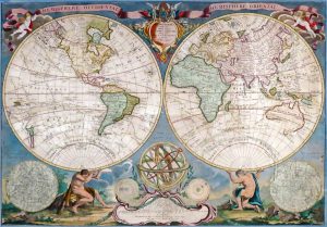 Double hemisphere world map with outstanding decoration figuring Hercule with the skin of the Nemean Lion and Atlas carrying the Eastern and Western hemispheres. At the top two decorative ribbons held by two angels. In the lower half : Northern and Southern celestial hemispheres, an armillary sphere as well as representations of the old Ptolemaic and the modern world system. The general design is influenced by J.B. Clouet's world map, published by Mondhare in 1775. Mondhare's map was intended to decorate libraries and salons of 18th Century aristocracy, depicting progress both in discoveries and scientific models of the universe. As such the map provides a fine depiction of the routes taken by modern explorers.