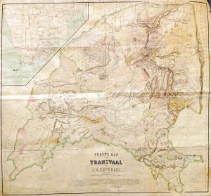 Troye's greatest cartographical achievement and according to Prof. Elri Liebenberg "the most complete, accurate and attractive map of the Transvaal produced up to that time". Gustav Troye was an associate of Fred and Charles Jeppe. After years spending to fit the patchwork of incompatible cadasters, their joint forces resulted in compilation maps on both sides. This map, inspired by Jeppe's third map of 1889, is compiled from actual surveys and supplemented with valuable information from Fred Jeppe, Richard Kelsey Loveday and others. Troye used farm diagrams and inspector's records to map farm boundaries and list farm names, hence the most striking feature of this map is a network of red lines crisscrossing the landscape. With an inset map of South-Africa on scale 1/5000000.
