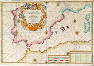 Carte de la partie occidentale de la Méditerranée avec la péninsule ibérique, la côte septentrionale de l'Afrique, les Îles Baléares, la Sardaigne et la Corse. Agrémentée d'un grand cartouche par Peter Starckman.