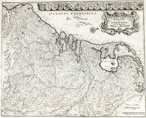 (1). MERIAN, Matthias.- Belgii sive Germania Inferioris. Nider-Teuschlandt. [Frankfurt, Matthias Merian/W. Hoffmann, 1638]. TC 29,3 x 36 cm + marges (pli central). Carte orientée vers la mer à l'ouest avec écussons des XVII Provinces. Probablement la première carte générale des Pays-Bas imprimée en Allemagne. Extraite de "Neuwe Archontologia Cosmica" par J.L. Gottfried ou de "De rebus publicis Hanseaticis tractatus" par J.A. Werdenhagen; # Van der Heyden 98.-- (2). KAERIUS, Peter.- Inferioris Germaniae Descriptio. [Arnhem, Jan Jansen, 1613]. TC 14,6 x 20 cm + marges. Extraite de l'édition latine de "Omnium Belgii sive Germaniae regionum descriptio" par Guicciardini; # Van der Heyden 71b.