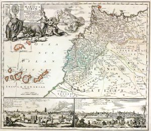 Carte du Maroc, des îles Canaries et de Madère avec vues des villes de Marrakech et de Meknès. Cartouche figurant des marchands, un soldat, des animaux, etc.