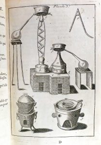 Traite des minéraux (purification de l'or, sel de Saturne, liqueur de cailloux...), des végétaux (jalap, huile et esprit de papier, distillation des fraises...), des animaux et hommes (distillations de la vipère, du crâne et cerveau de l'homme...) et donne divers remèdes (contre la peste, la "colique venteuse"...). Illustré du portrait de Lémery (1645-1715), médecin et pharmacien, de 7 pleines pages figurant des fourneaux et avec un tableau dépliant expliquant les symboles utilisés en chimie. L'édition originale date de 1675.