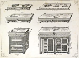 Recueil de planches de design industriel de style Napoléon III, gravées à l'eau-forte ou lithographiées en noir, illustrant diverses utilisations du gaz : becs de cuisinière, rôtissoire, four, piano de cuisine, etc., sinon essentiellement des lampes, appliques et lustres.