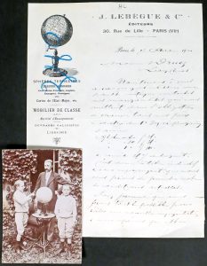JOINT : Photogr. originale, 13 x 9 cm, figurant Lebègue et ses enfants dans un jardin, près d'un globe posé une table.